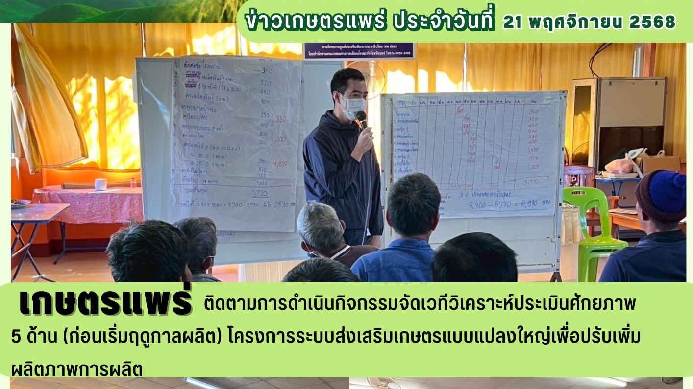 วันที่ 21 พฤศจิกายน 2568 นางสาวอัญชลี ปัญญากวาว เกษตรจังหวัดแพร่ มอบหมายให้เจ้าหน้าที่กลุ่มส่งเสริมและพัฒนาการผลิต สำนักงานเกษตรจังหวัดแพร่ ติดตามการดำเนินกิจกรรมจัดเวทีวิเคราะห์ประเมินศักยภาพ 5 ด้าน (ก่อนเริ่มฤดูกาลผลิต) โครงการระบบส่งเสริมเกษตรแบบแปลงใหญ่เพื่อปรับเพิ่มผลิตภาพการผลิต กลุ่มแปลงใหญ่ข้าวโพดเลี้ยงสัตว์ หมู่ที่ 3 ตำบลร้องเข็ม อำเภอร้องกวาง จังหวัดแพร่ และกลุ่มแปลงใหญ่ข้าวโพดเลี้ยงสัตว์ หมู่ที่ 6 ตำบลร้องกวาง อำเภอร้องกวาง จังหวัดแพร่ เพื่อทราบถึงสถานะปัจจุบันของกลุ่มแปลงใหญ่ และนำข้อมูลที่ได้จากการวิเคราะห์มาวางแผนพัฒนาการผลิต เพื่อลดต้นทุน เพิ่มประสิทธิภาพการผลิต การจัดการด้านการตลาด และร่วมวางแผนการดำเนินกิจกรรม ภายใต้โครงการต่อไป ณ ศาลาประชาคม หมู่ที่ 3 ตำบลร้องเข็ม และหมู่ที่ 6 ตำบลร้องกวาง อำเภอร้องกวาง จังหวัดแพร่